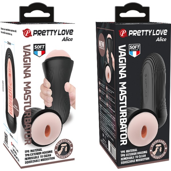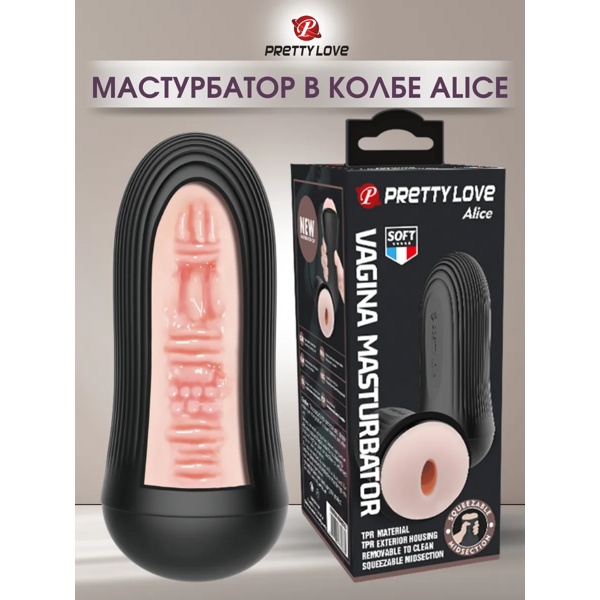 Модель Pretty Love Alice отличается тем, что оболочка колбы выполнена из податливого материала, что позволяет сжимать игрушку в руке, усиливая воздействие на пенис при фрикциях.
