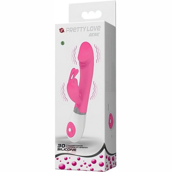 Pretty Love Gene - вибратор с клиторальным отростком в форме кролика, выполнен из мягкого, приятного на ощупь и абсолютно гипоаллергенного материала. Ствол игрушки имеет изогнутую форму и увеличенную головку, что обеспечит стимуляцию точки G, которая подарит незабываемые ощущения. Игрушка обладает тридцатью различными функциями, которые управляются при помощи встроенного контроллера. Моторчики расположены в обоих отростках, они создают мощную, но абсолютно бесшумную вибрацию, которая распространяется по всей поверхности массажера. Водонепроницаемый корпус дает возможность использовать его в душе или ванной.