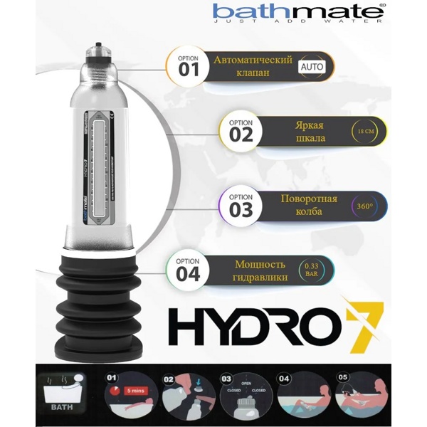 Гидропомпа Bathmate Hydro7 абсолютно безопасна, проста в использовании и эффективна – она удобно крепится на основании пениса, не вызывая дискомфорта, и создает достаточное давление для эффективных тренировок, не требуя постоянной подкачки.
