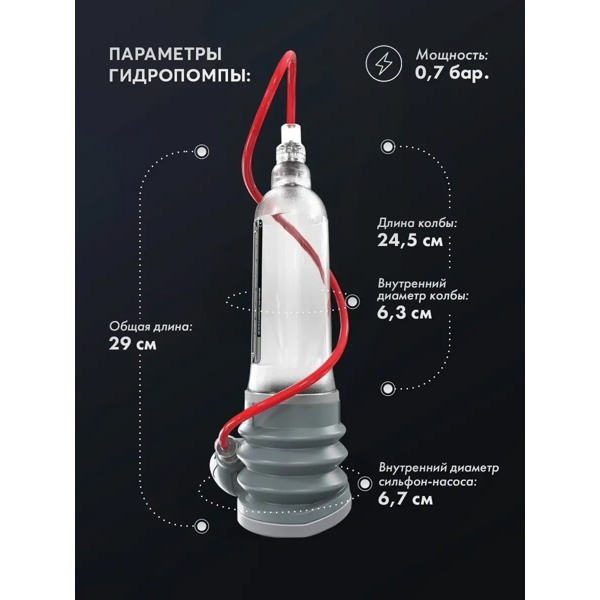 HYDROXTREME9 - Гидро-помпа позволяет создавать вакуум как при помощи гофры, так и с помощью ручной груши. для члена длиной от 18 до 23см, диаметр до 5,5см