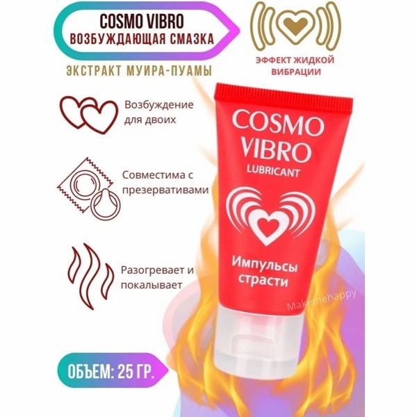 Вязкий — не жидкий любрикант «Cosmo vibro» на силиконовой основе — быстро в течении 1 минуты вызывает приятное ощущение тепла, которое переходит в нежную «вибрацию», а затем в сильную вибрацию и возбуждающие мурашки, ощущаемые изнутри сливающихся тел! густой гель для ощущений «Cosmo vibro» дарит наслаждение обоим партнером, обеспечивая длительное скольжение.