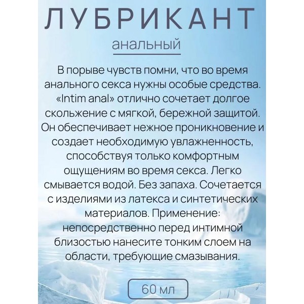 «Intim Anal» - Анальный гель-любрикант отлично сочетает долгое скольжение с мягкой, бережной защитой. Он обеспечивает нежное проникновение и создает необходимую увлажненность, способствуя только комфортным ощущениям во время секса. Легко смывается водой. Без запаха. Сочетается с изделиями из латекса и синтетических материалов.