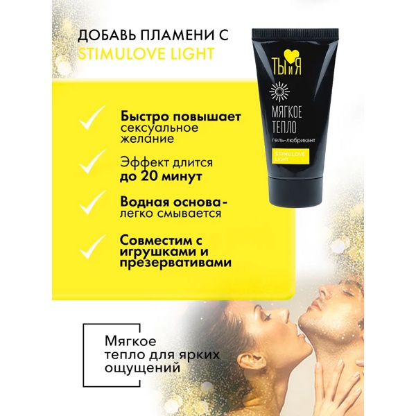 Гель-любрикант усиленного действия «StimuLove Light» из коллекции «Ты и Я» предназначен для искушенных и активных ценителей острых ощущений. Обладает мгновенным разогревающим эффектом длительностью до 40 минут, прекрасно стимулирует сексуальное возбуждение у обоих партнеров и обеспечивает продолжительное скольжение на протяжении всего полового контакта. Любрикант не оставляет следов на одежде и легко смывается обычной проточной водой.