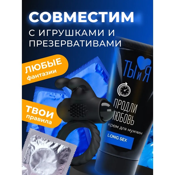 «LongSex» – крем для мужчин. Прежнее название – крем М1. Стоп-крем быстрого действия. Активно впитывается. Ухаживает за кожей полового члена, оказывает смягчающее и успокаивающее действие. На яркость ощущений, эрекцию и потенцию не влияет. Эффект наступает через 5-7 минут после нанесения. Совместим с презервативами, изделиями из латекса и синтетических материалов и любыми средствами секс-косметики.