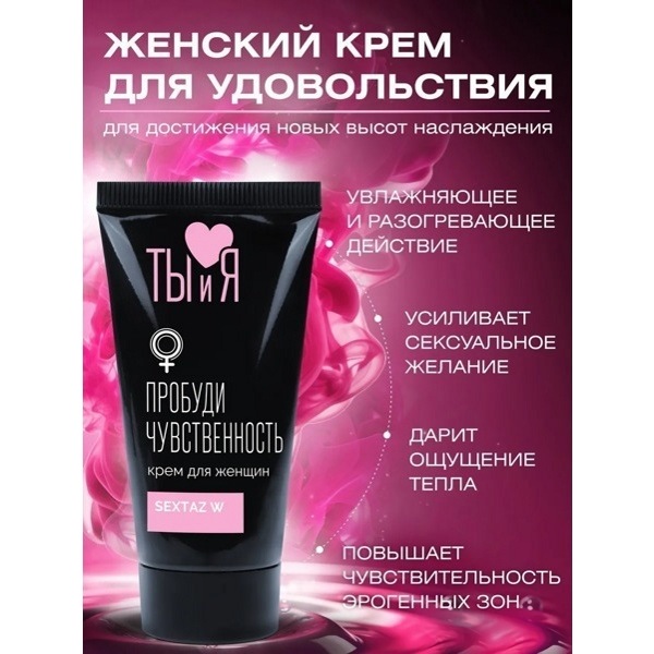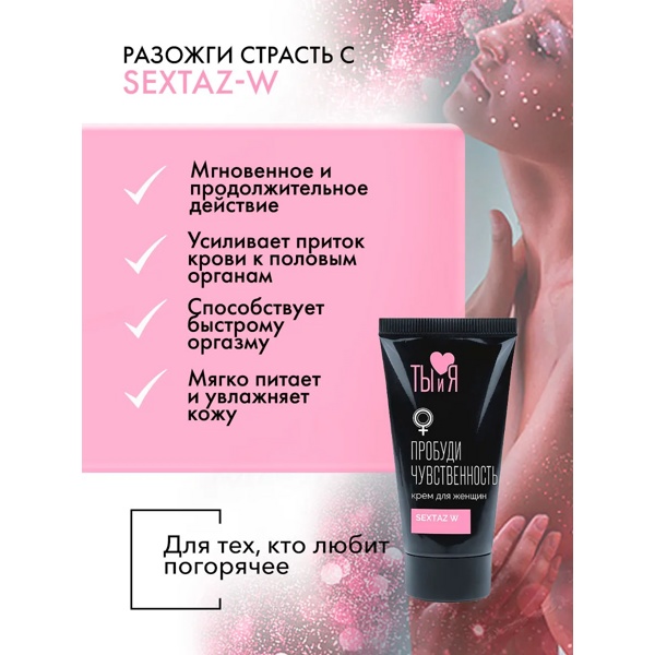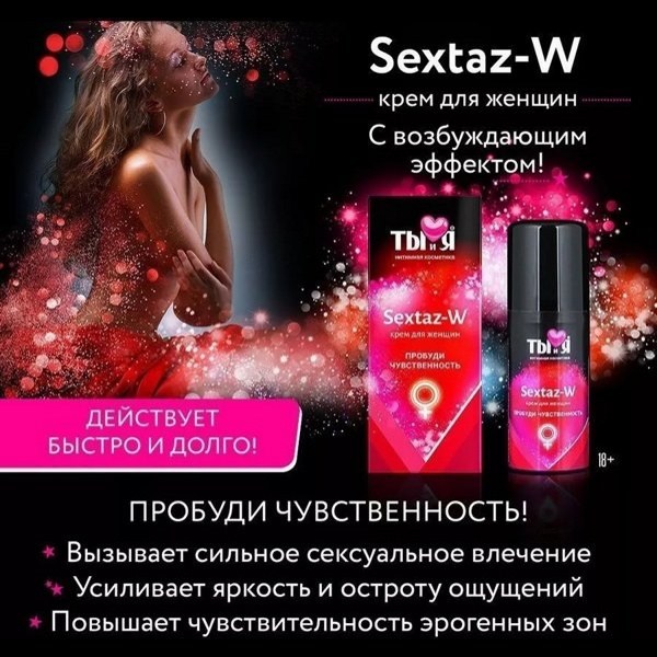 «SexTaz-W» - Нежный крем для повышения чувствительности и усиления желания, способствует более глубокому оргазму. Наносится на эрогенные зоны женщины (соски, половые органы) перед интимной близостью и втирается мягкими массирующими движениями. Смягчает, разогревает, увлажняет кожу и слизистые, ухаживая за ними и продлевая их молодость. Начинать с 1-2 капель, при необходимости увеличивая дозу. Совместим с любыми изделиями из латекса и синтетических материалов.