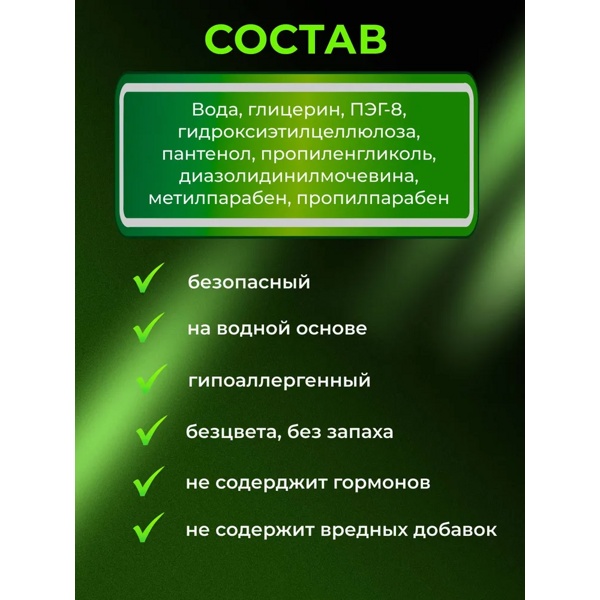 Состав: вода, глицерин, ПЭГ, карбамид, пантенол, натрий КМЦ, диазолидинилкарбамид, метил-, пропилпарабен. Возможна индивидуальная гиперчувствительность.