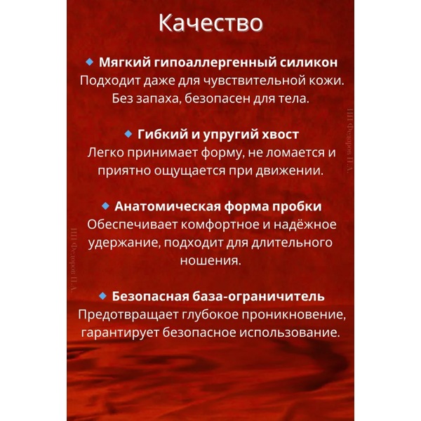 Размеры: общая длина 32 см, длина хвоста 23 см, длина пробки 9 см, максимальный диаметр пробки 3,2 см