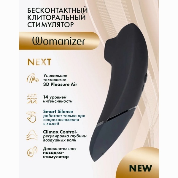 1. Womanizer Next — это стимулятор с технологией Pleasure Air, которая улучшена с помощью функции Climax Control. Она меняет глубину воздушных волн и делает ощущения более насыщенными. В Next предусмотрены 3 уровня регулирования Climax Control и 14 уровней интенсивности для Pleasure Air. Все режимы переключаются кнопками