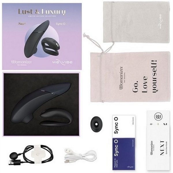 Womanizer Next, дополнительная насадка, We-Vibe Sync O, беспроводной пульт дистанционного управления, батарейка CR2032 х 1 шт., магнитные USB-кабели для зарядки, инструкции по эксплуатации, 2 мешочка для хранения игрушек.
