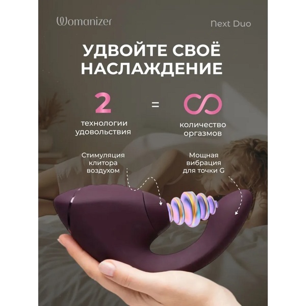 Womanizer Next Duo – передовой двойной стимулятор, объединяющий технологию 3D Pleasure Air и Dynamic Dimension Drive от Womanizer с глубокими вибрациями точки G от We-Vibe!